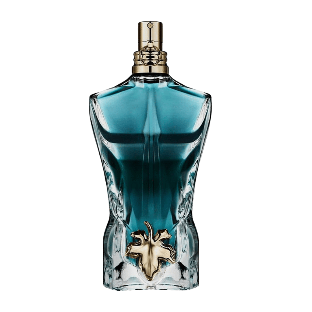 El frasco de Le Beau Eau de Toilette sigue la estética icónica de la línea masculina de Jean Paul Gaultier: un torso masculino, esta vez en cristal verde esmeralda, adornado con una hoja de parra dorada en la zona central. Es provocador, artístico y perfectamente alineado con el concepto de tentación tropical.